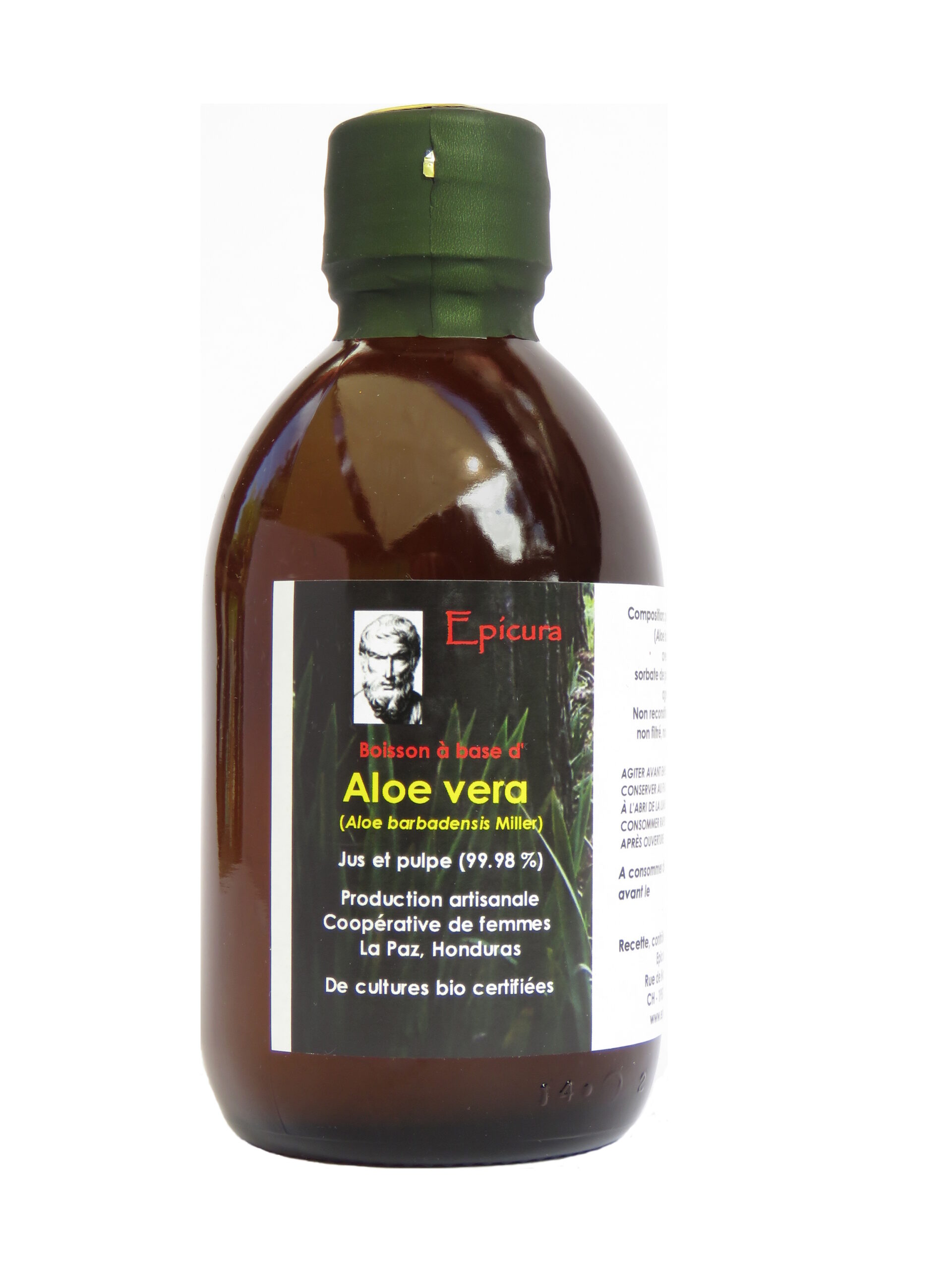 Cette boisson se compose à 99.98% du jus de la pulpe des feuilles d’aloès (Aloe vera Linné ou Aloe barbadensis Miller) de cultures bio certifiées.